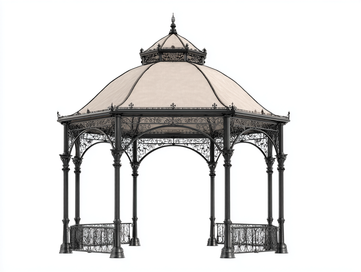 Gazebo da giardino progettato per creare una zona coperta elegante e funzionale in ambienti esterni. La struttura aperta consente una buona circolazione dell'aria offrendo al tempo stesso protezione e ombreggiatura per aree relax o spazi di ricevimento all'aperto.