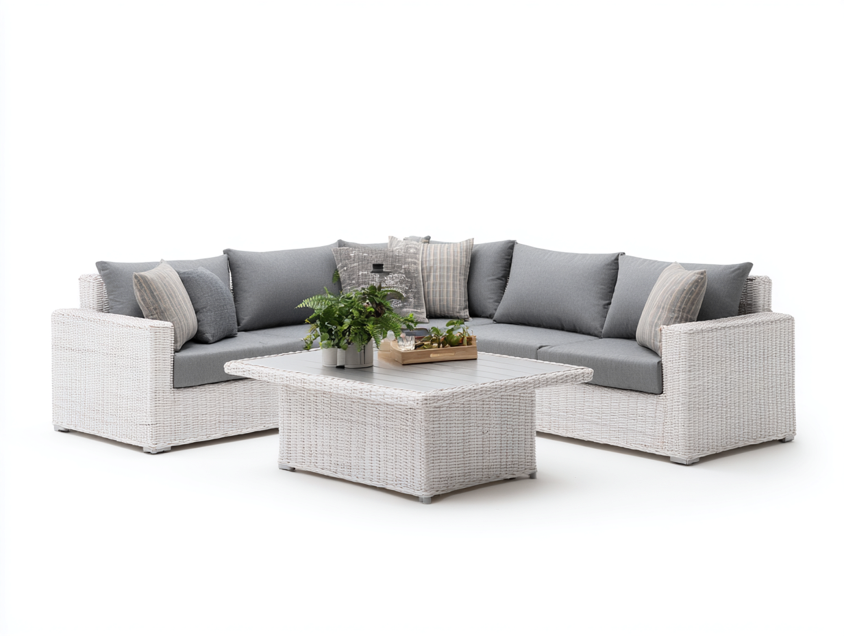 Set da giardino composto da un divano angolare e un tavolino coordinato, progettato per arredare spazi esterni con una soluzione funzionale e ordinata. La struttura compatta consente di creare un'area relax adatta a terrazze e giardini.