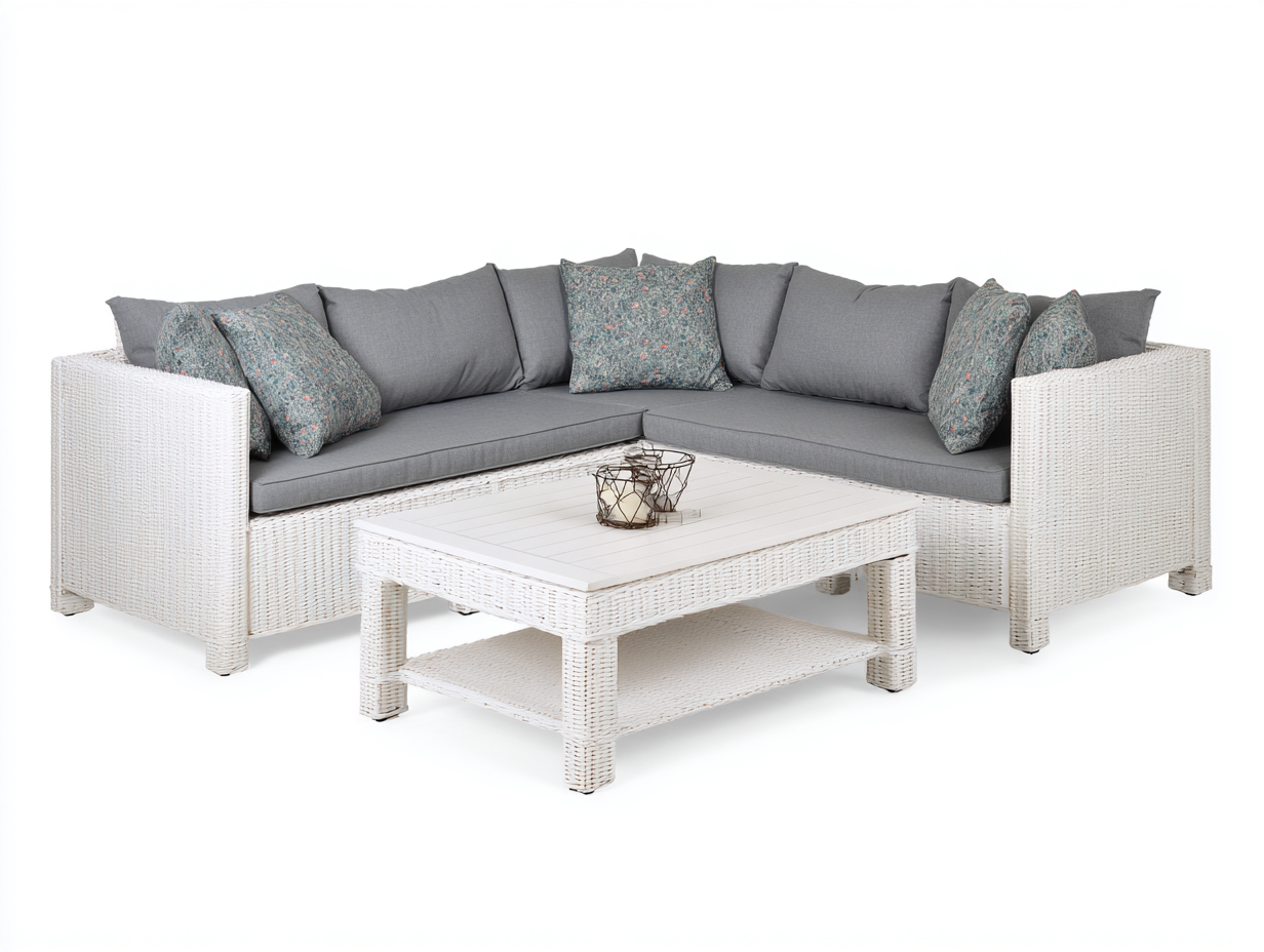 Set da giardino composto da divano angolare e tavolino coordinato, progettato per arredare spazi esterni come terrazze e giardini con una soluzione ordinata e funzionale. La configurazione angolare consente di sfruttare al meglio l'area relax mantenendo una disposizione equilibrata.