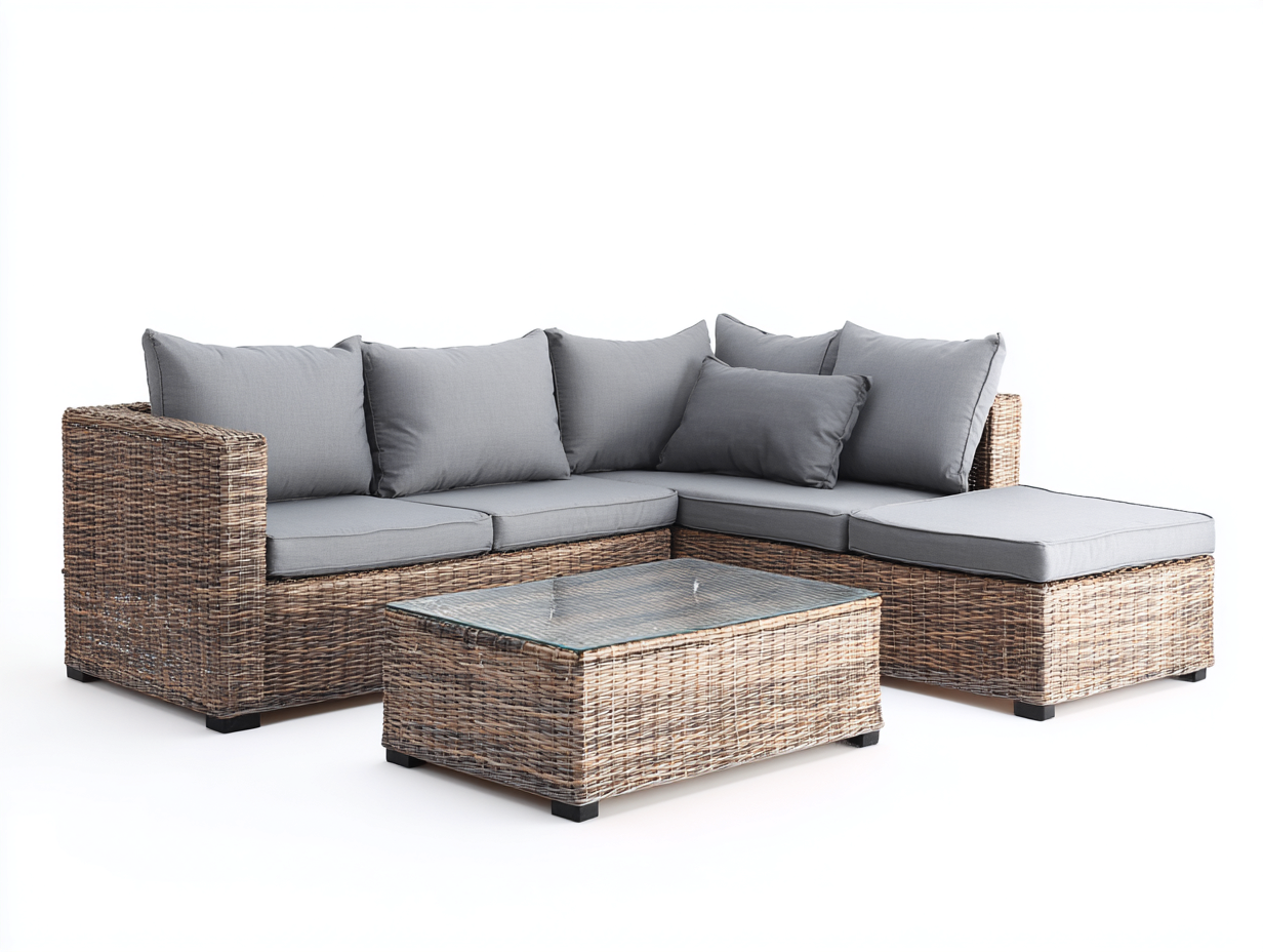 Set da giardino composto da divano angolare e tavolino coordinato, progettato per creare una zona relax funzionale e ordinata all'aperto. La struttura compatta lo rende adatto a giardini e terrazze.