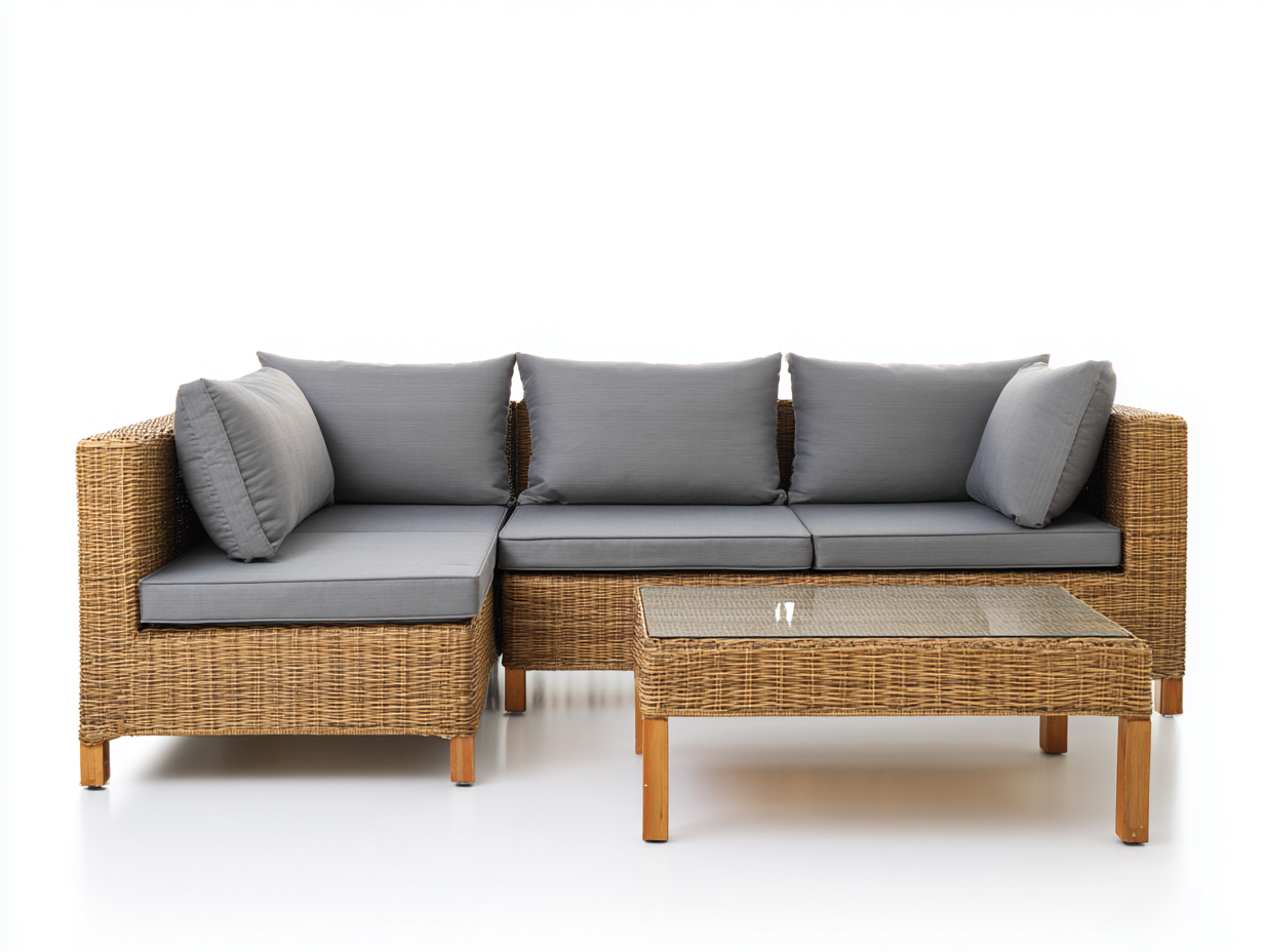 Set da giardino composto da divano angolare e tavolino coordinato, pensato per creare uno spazio confortevole all'aperto. Il design lineare consente un inserimento armonioso in giardino o terrazza.