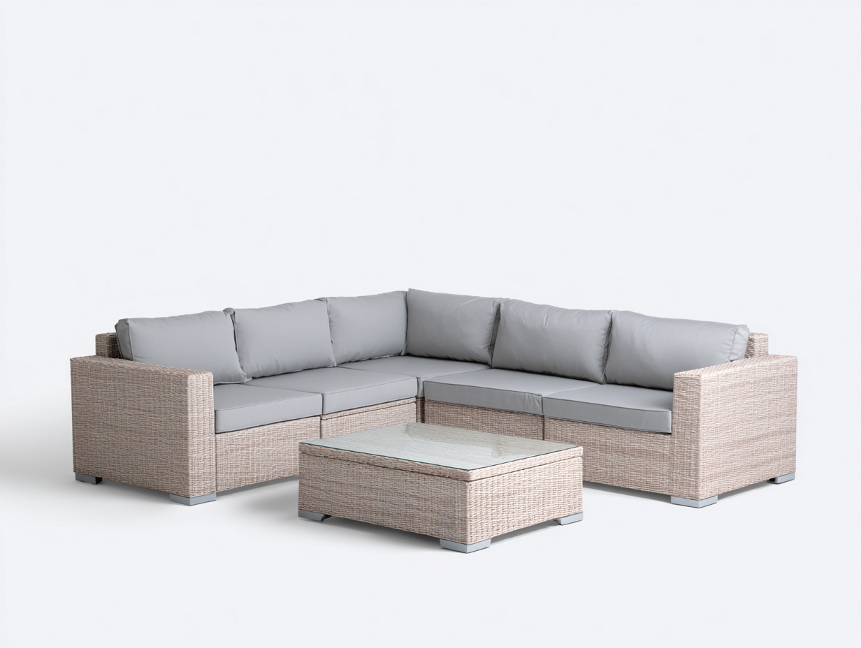 Set da giardino composto da divano angolare e tavolino coordinato, progettato per creare uno spazio ordinato e confortevole all'aperto. Il design compatto si integra facilmente in giardini e terrazze.