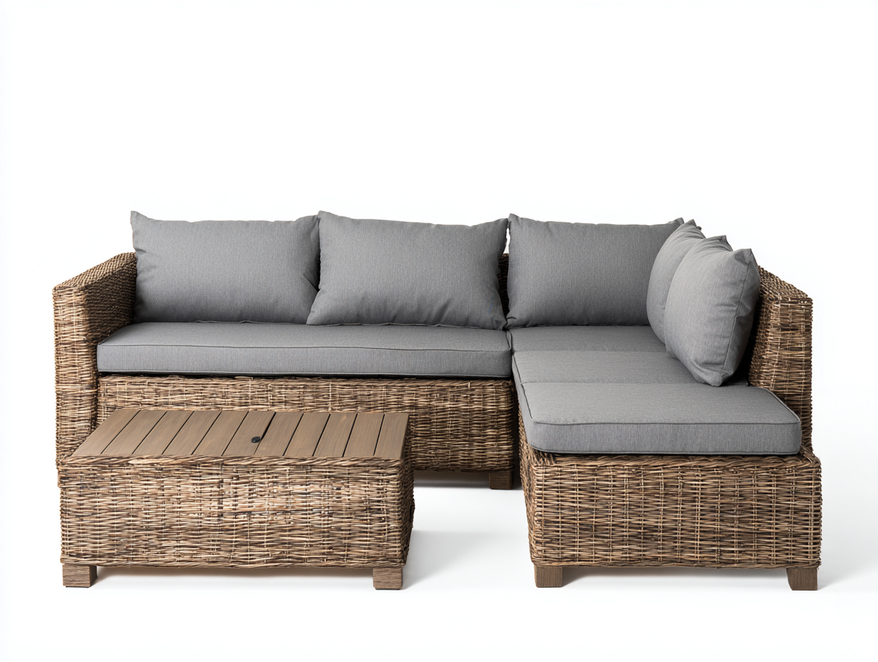 Set da giardino composto da divano angolare e tavolino coordinato, progettato per creare uno spazio relax funzionale all'aperto. La struttura compatta consente un utilizzo ordinato in giardino, terrazza o patio.