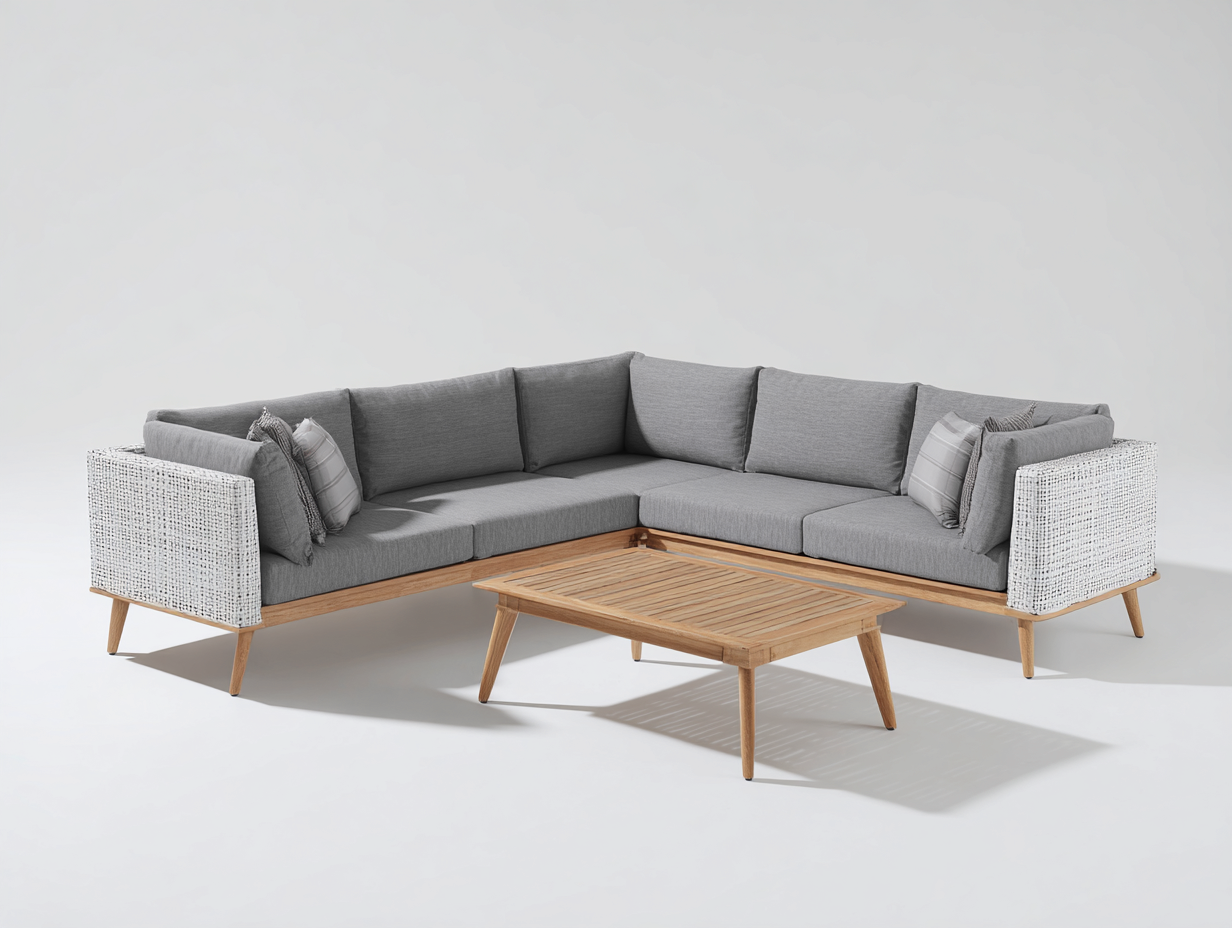 Set da giardino progettato per creare un'area relax funzionale e ordinata all'aperto. La configurazione con divano angolare e tavolino consente un utilizzo confortevole in giardino, terrazza o patio.
